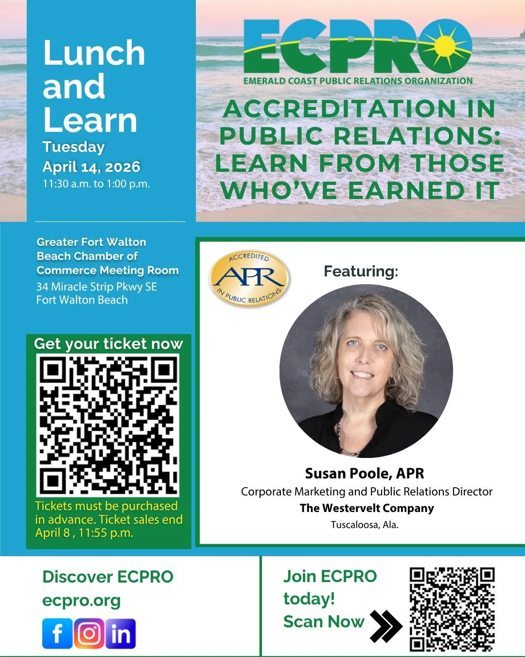 One scholarship is sponsored by Eglin Federal Credit Union. The second is the Sherry Harlow, APR Scholarship, made possible by a grant from Ms. Harlow. The awards are based on academic credentials, volunteer and service work, and an original essay that addresses an issue of importance to the public relations or marketing fields.